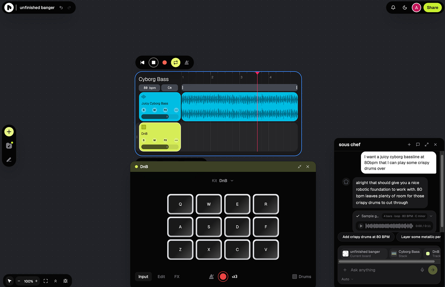 Sous Chef is exactly what the name suggests: you’re the chef, but it’s there to help you cook. You explain in natural language what kind of sound you’re feeling, and it whips up a sample that you can edit, either by adjusting the prompt or by layering on FX.