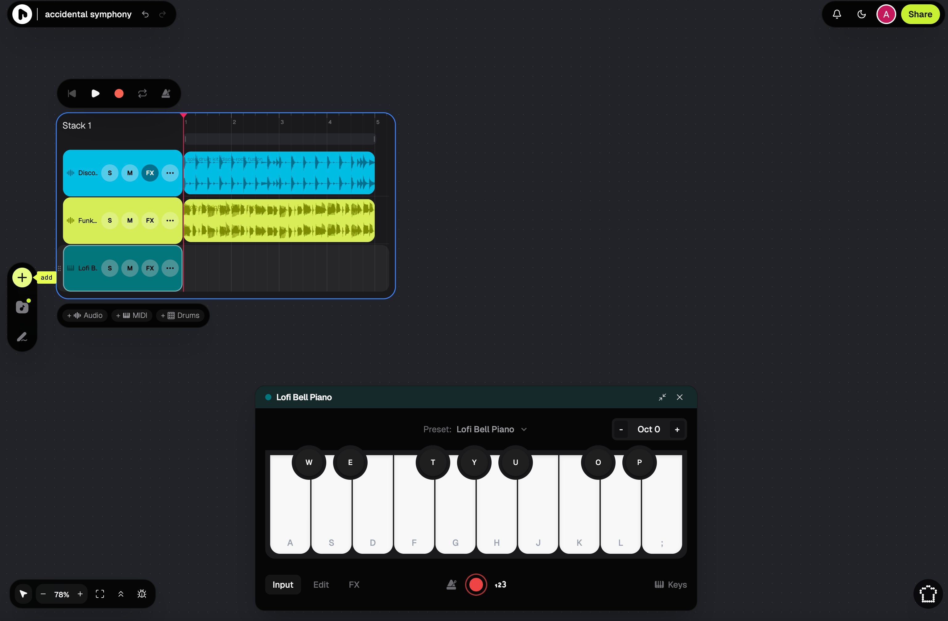 Creativity is different. It’s messy, scattered, and often seeks to break out of a rigid vessel. It’s “what if there’s a samba here” and “actually, maybe a duet over there” and six half-formed ideas floating around before one of them earns the right to become a track. Both founders knew this from experience - they’d look at the DAW and lose their motivation to actually make music. The software was actively getting in the way.